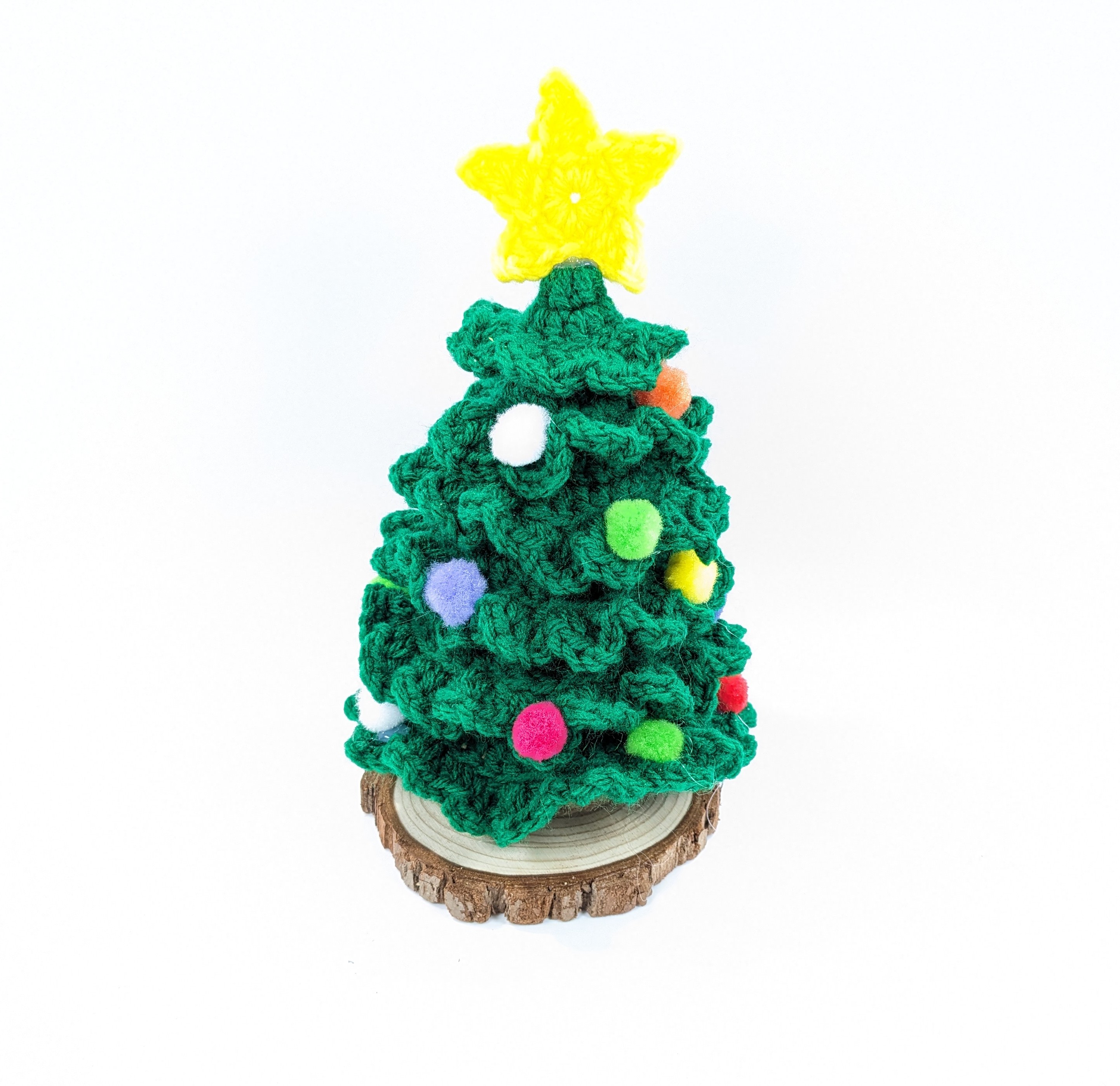 Crochet with acrylic yarn. Pom-pom's added for ornaments and tree is attached to a slice of wood.
