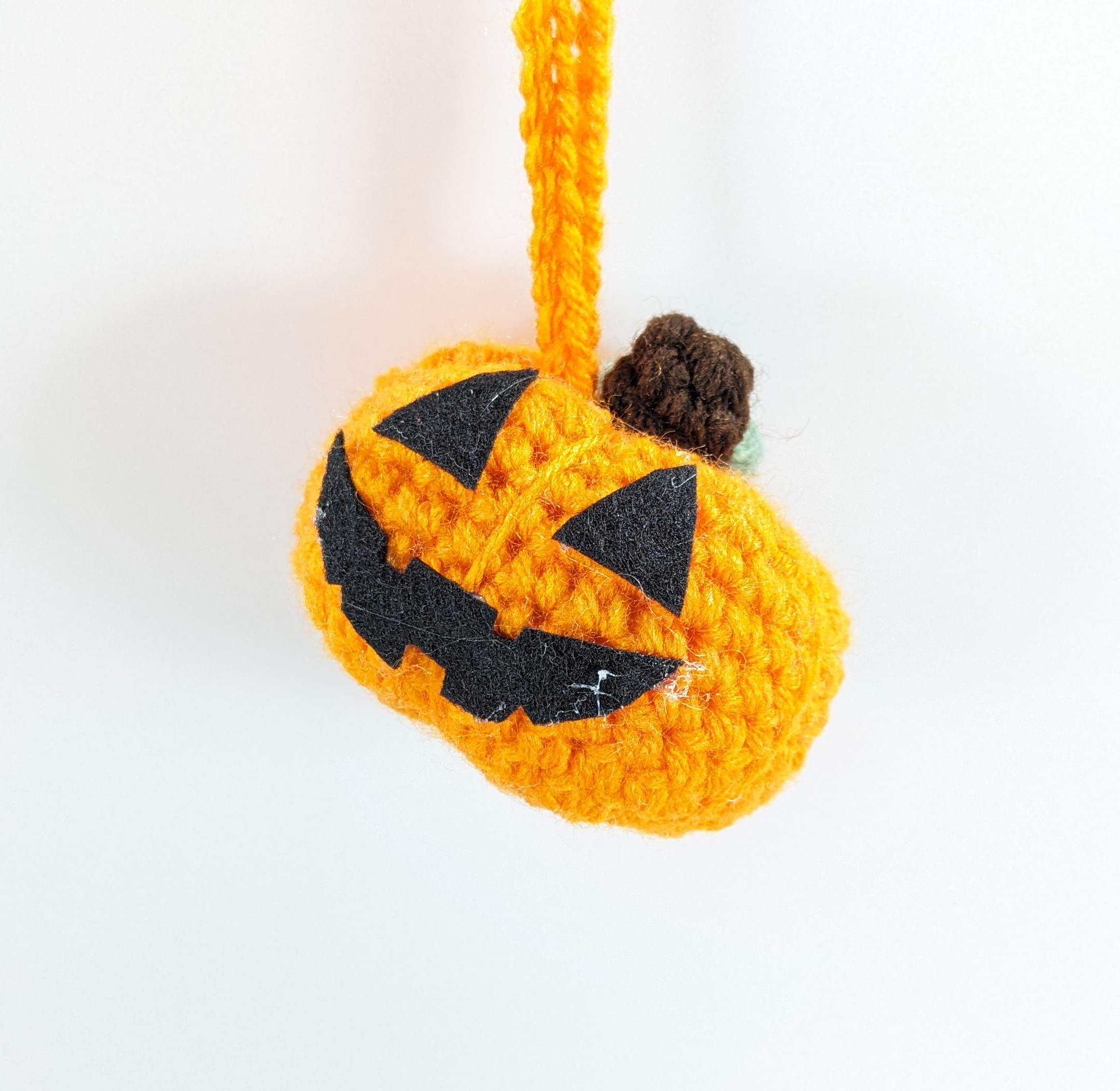 Also this cute Jack-O-Lantern Plush Car Decor is crochet with acrylic yarn and filled with a small amount of fiberfill. His mouth and eyes are made of felt and glued on.